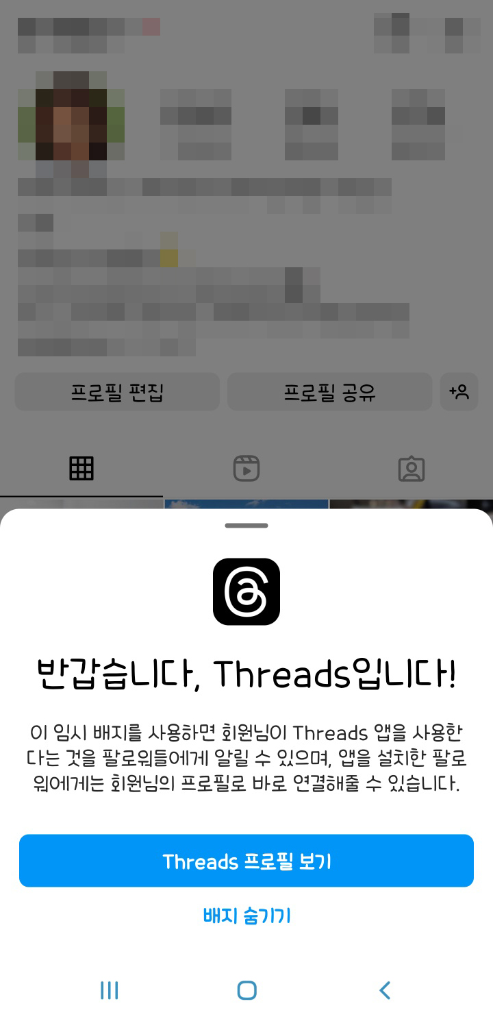 설치와 가입을 마친 후 인스타그램에 접속하시면 본인 프로필 아래에 스레드 배지가 생성되어 있습니다.